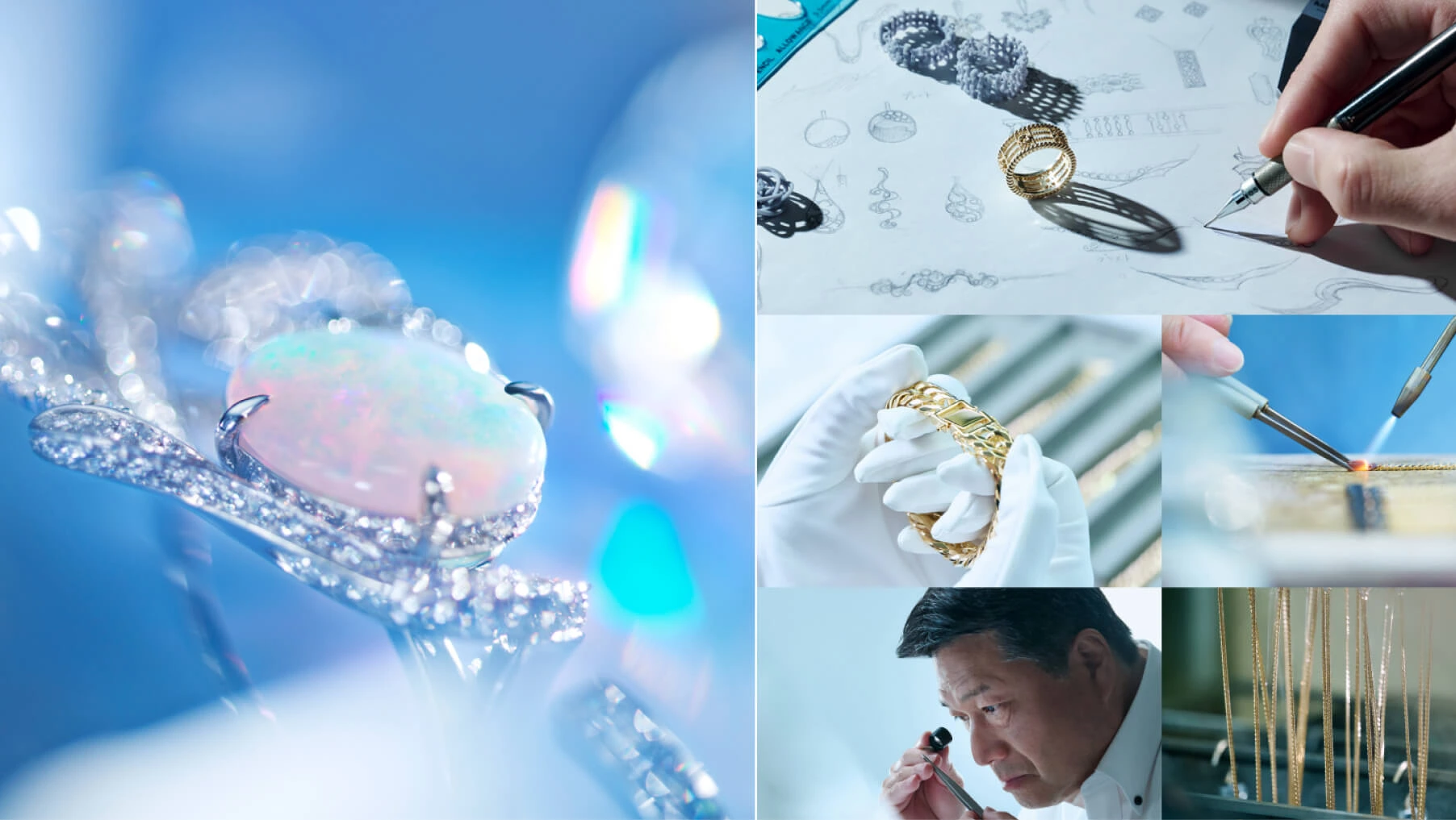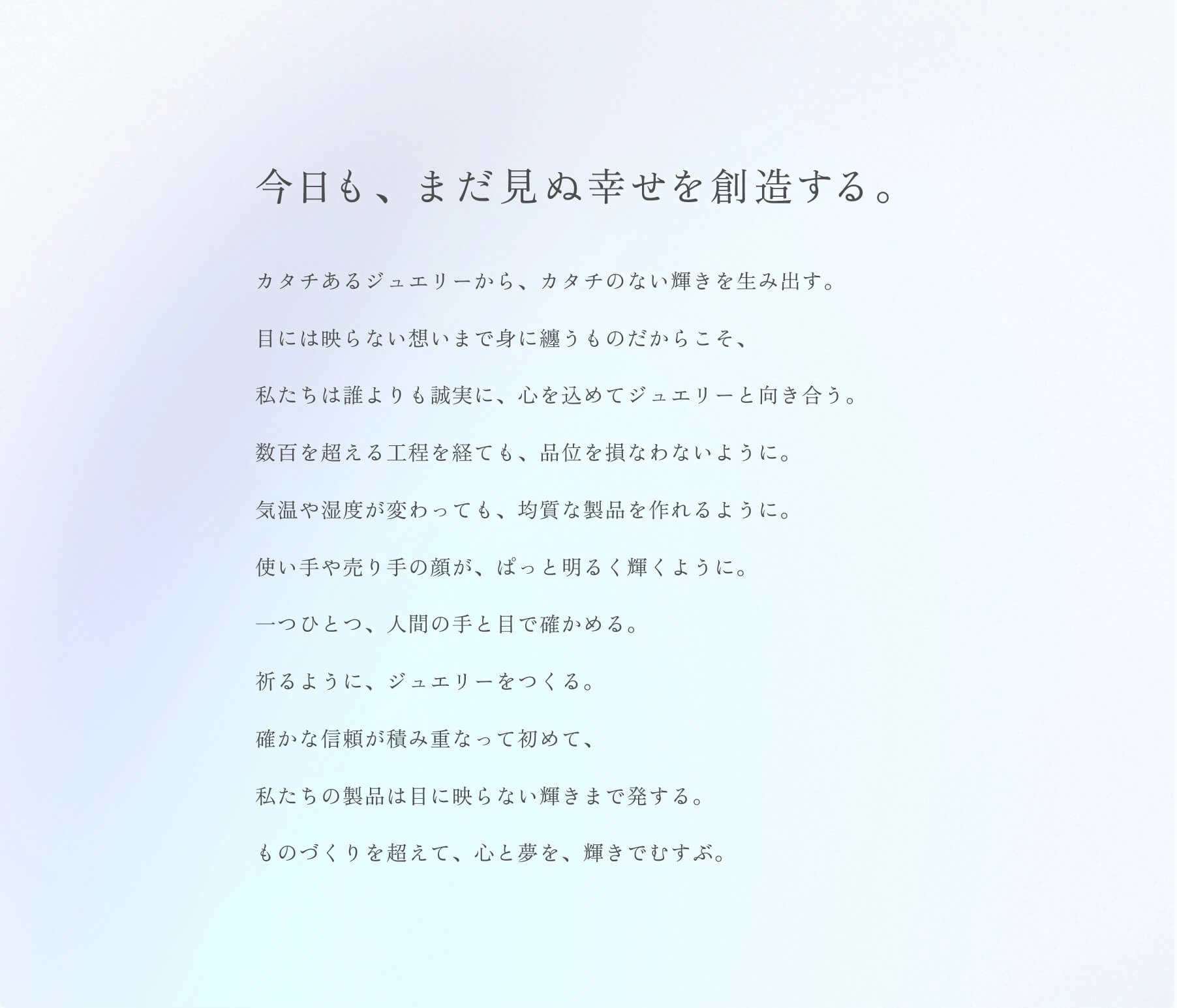 言語化されたブランドストーリーを、コーポレートサイトでの体験へと落とし込みました。トップビジュアルにはWebGLを用いた有機的な輝き表現を採用し、ジュエリーの質感や地金の表情を抽象化。視覚的な強さではなく、ブランドの空気感に静かに入り込む体験を目指しています。UIデザインでは、コーポレートブルーを基調に、白やグレイッシュなトーンを重ね、余白設計を重視。情報量の多いBtoBサイトでありながら、信頼できるパートナーとしての佇まいを感じさせる構成としました。コンテンツ構成は、工程の美しさ、完成品の品質、ブランドの精神へと感情が自然に連なっていく流れを意識しています。見えない努力と、目に見える価値がひとつにつながる体験です。