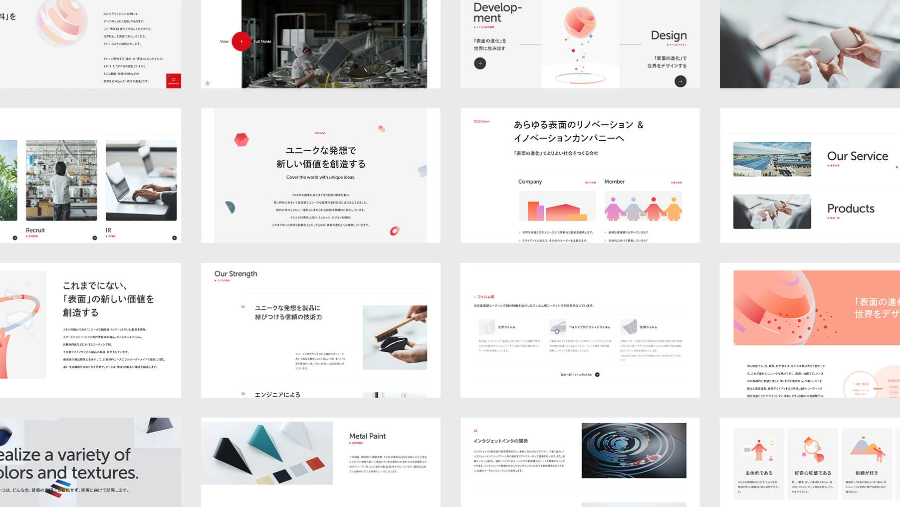 企業の正体を伝える3層構造。英語コピー「Cover the world with unique ideas.」で世界観を直感的に示し、日本語コピー「表面の進化で、よりよい社会をつくる会社。」で企業の正体を端的に伝え、イントロ「塗料は、塗料を超えていく。」で技術の本質を表現しました。サイト冒頭では、抽象形状が塗られていくモーション演出により「表面の進化」というコンセプトを表現。ムービーでは「まだ塗られていない表面」から「価値が宿っていく過程」を実写で描き、働く社員の一日を軸に研究の検証、デザイン検討、工場の塗装プロセスを配置。技術を支える「人」の存在を伝える体験設計を行いました。