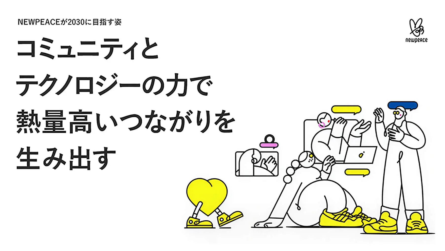 この二つの問いに対して、社内外の認識が齟齬なく共有される状態をつくること。同時に、これまで培ってきたブランド資産を継承しながら、新事業の提供価値を明確化し、経営判断と事業展開の起点として機能するコーポレート体験を構築することをゴールに設定しました。その指針として策定したのが、『NEWPEACE2030』です。「コミュニティとテクノロジーの力で、熱量の高いつながりを生み出す」。この言葉を掲示用のスローガンではなく、日々の意思決定において立ち返るべき「軸」として設計しました。