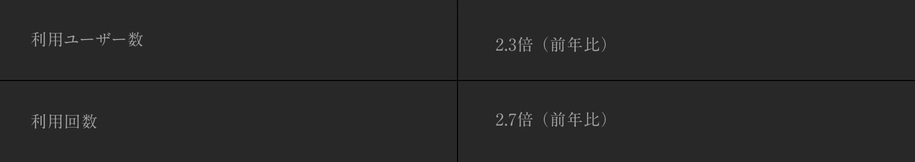 利用ユーザー数は前年比2.3倍に成長。利用回数は前年比2.7倍に成長しました。