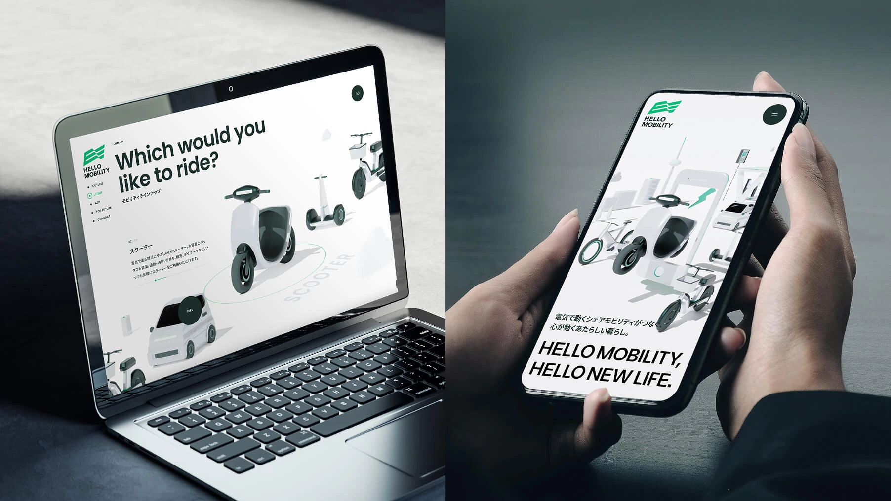 OpenStreet株式会社のモビリティシェアサービス「HELLO MOBILITY」のリブランド構築を支援しました。本サービスが「HELLO SCOOTER」からサービスを拡張し、スクーター、小型EV等のマルチモビリティシェアサービスへと進化するにあたり、サービスコンセプトの策定と、ブランドロゴ、ビジュアルアイデンティティ、Webサイト、グラフィックツールなどのデザイン制作を実施しました。