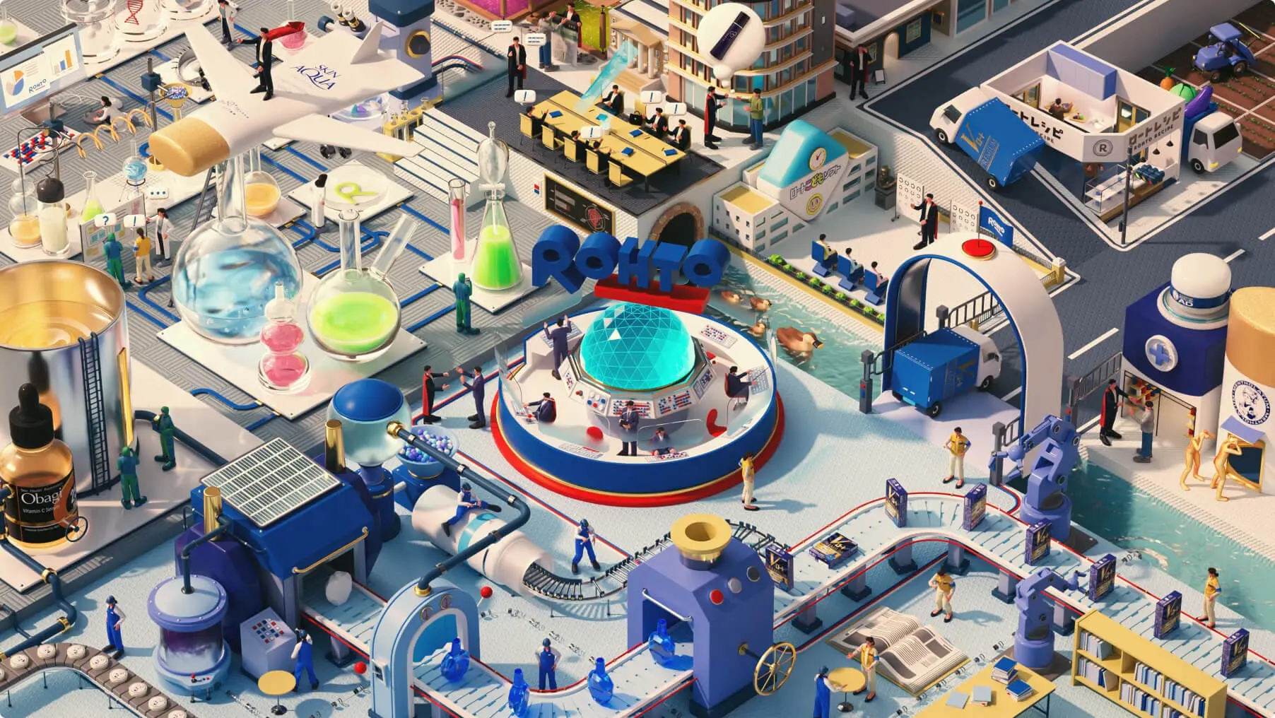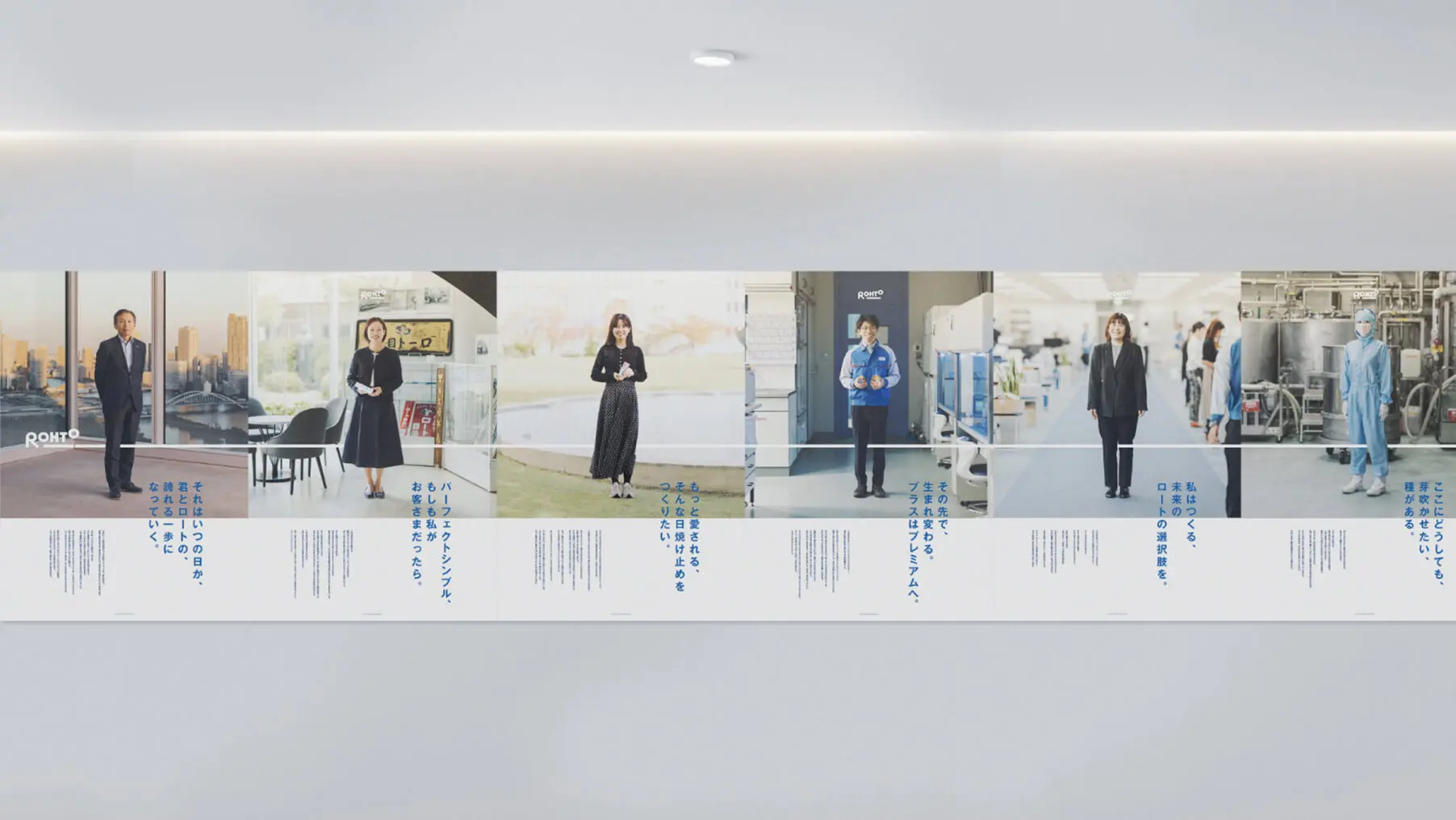 ロートタウンは、研究・マーケティング・生産・デザインなど、多様な専門職がどのように価値を生み出しているのかを「ひとつの街の営み」として表現。ロート特有の他領域と混ざり合いながら働く風土も自然に伝わるよう設計しています。