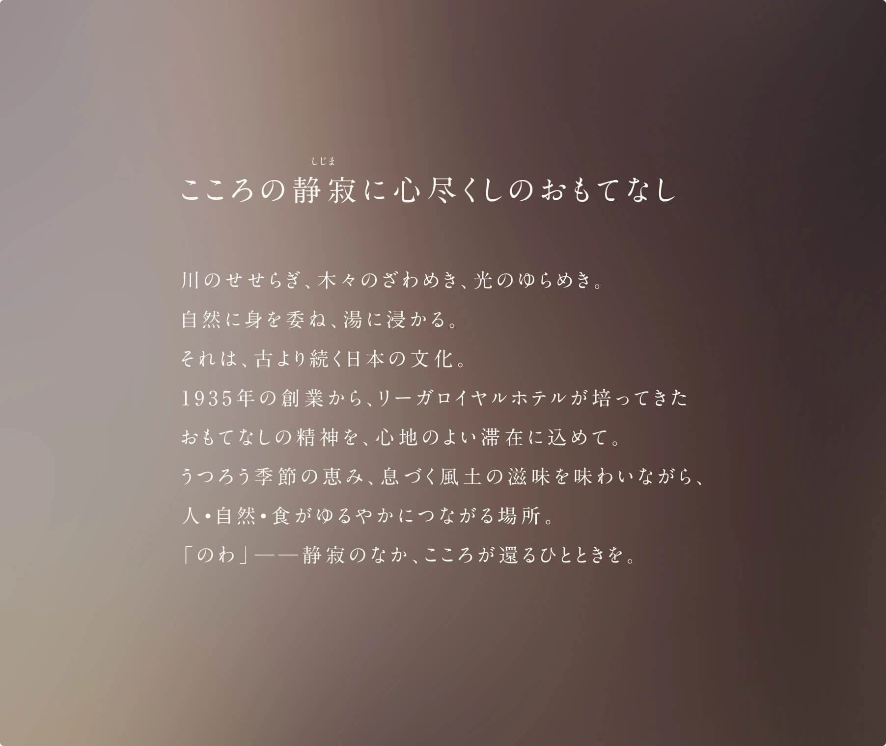 本プロジェクトの核心は、単なる宿泊施設の提供ではなく、新たな「和のリトリート」の定義にありました。ロイヤルホテルが守り続けてきた「あたたかい心、美食、接遇」の思想を、温泉リゾートという文脈でどう現代的に再解釈するか。賑わいや演出過多を排し、いかにして「静寂」そのものを至上の価値として提示できるか。人・自然・食がゆるやかに調和し、旅の余韻が日常まで浸透していく。その体験を端的に象徴したのが、「こころの静寂に、心尽くしのおもてなし」というブランドコンセプトです。静寂を単なる「音の欠如」ではなく、心と向き合うための精神的ラグジュアリーとして再構築することを目指しました。