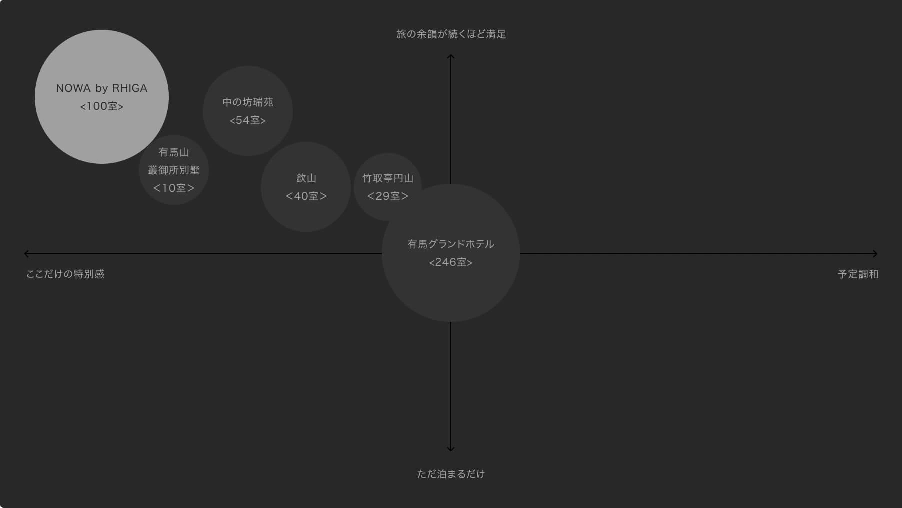 市場調査と競合分析を通じ、「ここだけの特別感」と「持続する満足度」を軸とした独自のポジションを特定。老舗旅館のおもてなしとも、外資系ホテルのサービスとも異なる、「静かなる革新」としての立ち位置を明確にしました。ブランド名「のわ」には、和、調和、つながりといった意味を内包させ、自身や自然と重なり合う場としての願いを込めています。