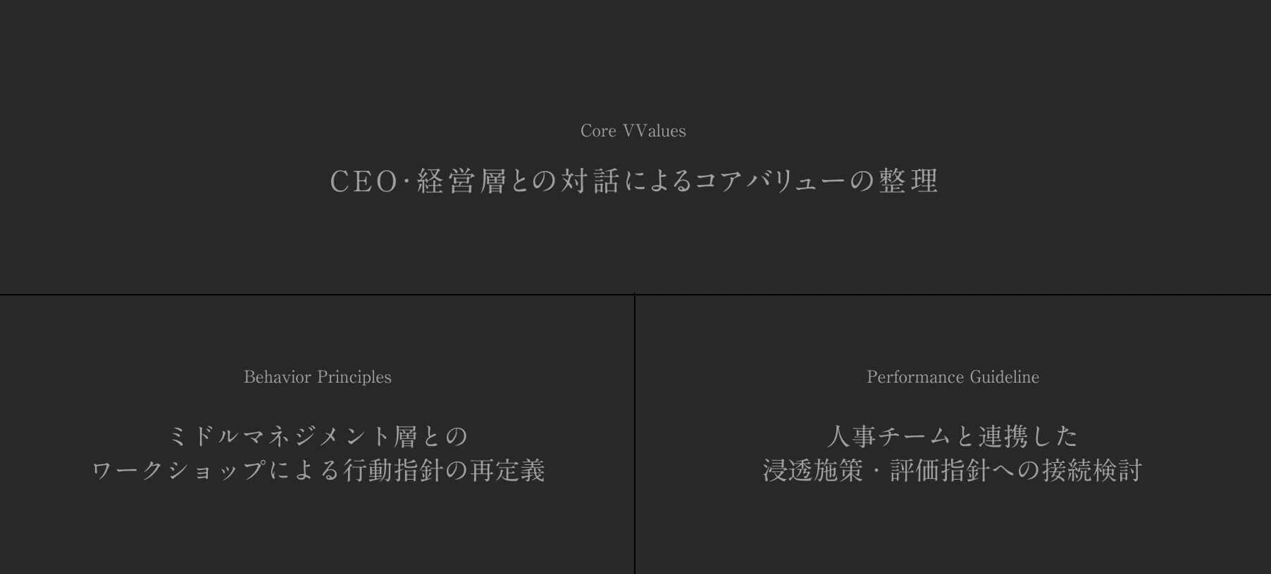 経営層との対話を通じて言語化した「信じる価値」を、ミドルマネジメント層とのワークショップを経て具体的な行動指針へと展開しました。現場でどのような振る舞いが賞賛され、評価や育成の場面でどう参照されるべきか。理念が「飾られた言葉」ではなく、日々の業務や評価の拠り所となるよう、組織のOSレベルでの再定義を行いました。